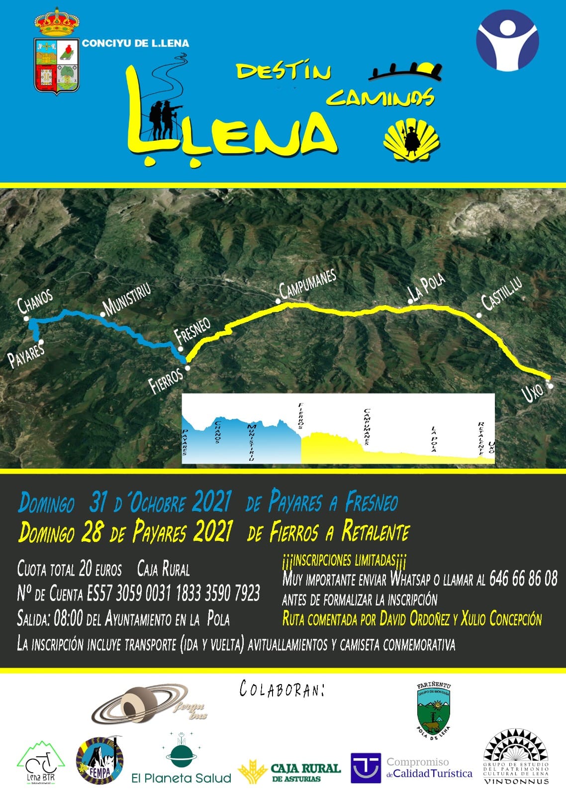 El Ayuntamiento de Lena, a través del Programa municipal ‘Ḷḷena Destin Caminos’, propone realizar el recorrido de la etapa del Camino de San Salvador, que discurre íntegramente por Ḷḷena. La actividad se dividrirá en dos jornadas, los domingos 31 de octubre y 28 de noviembre.