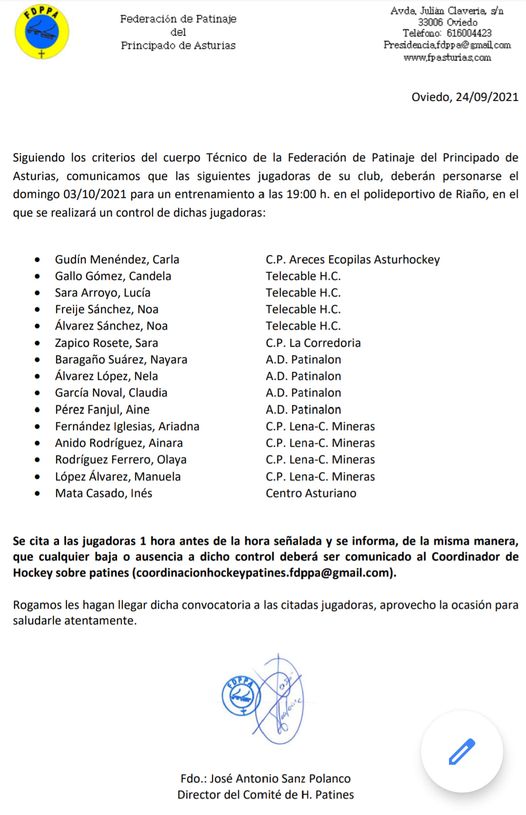 La selección asturiana de hockey patines convocó esti domingu a cuatro xugadoras del Club Patín Lena – Cuencas Mineras para un entrenamientu nel Polideportivu de Riañu. El club a felicitáu en redes sociales a les xugadoras, a les qu’encamentó a aprovechar la oportunidá.
