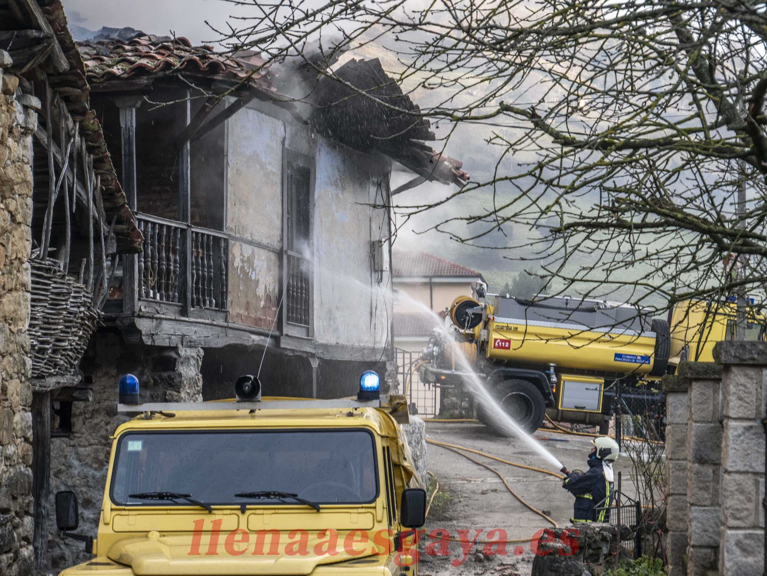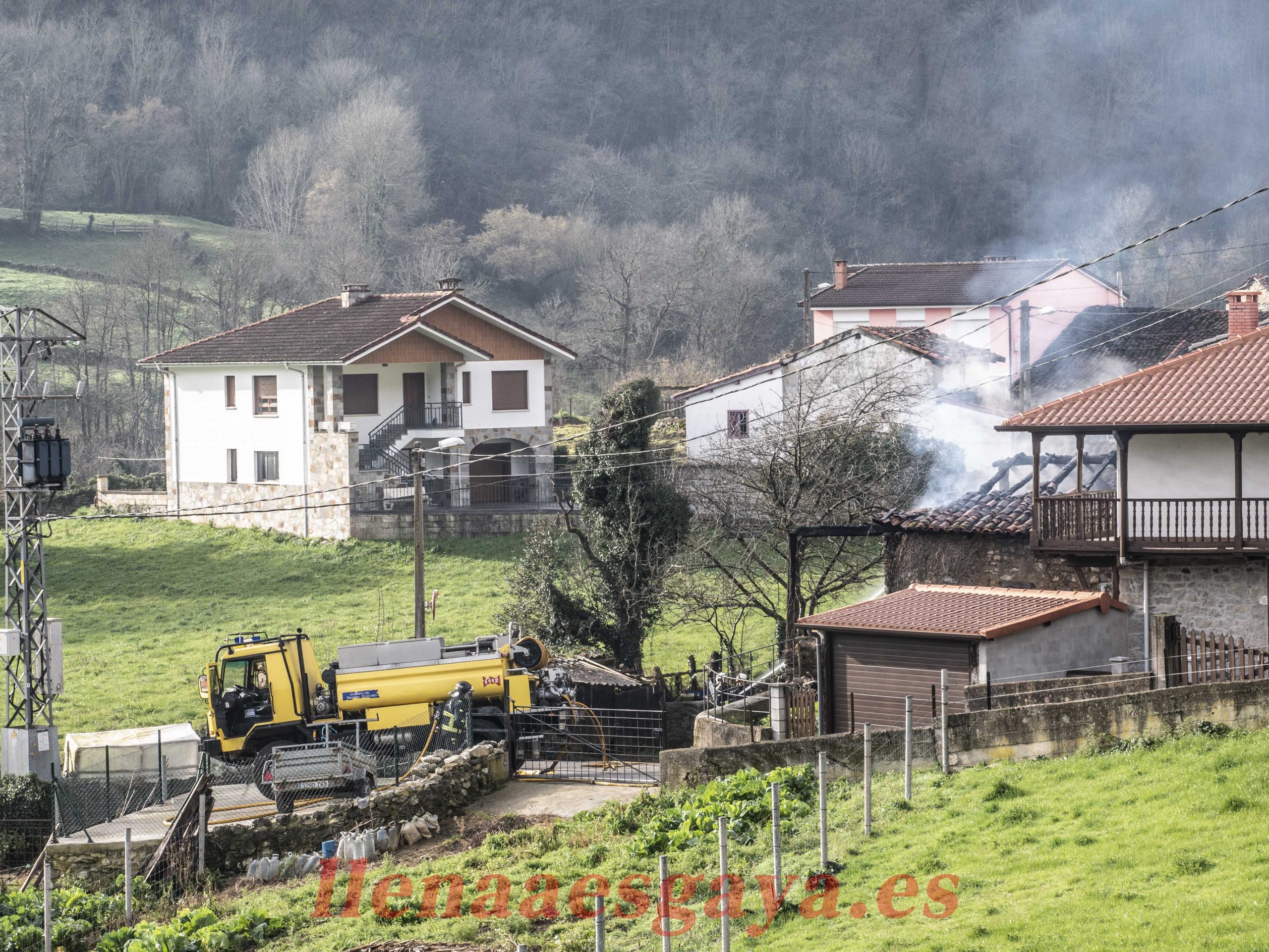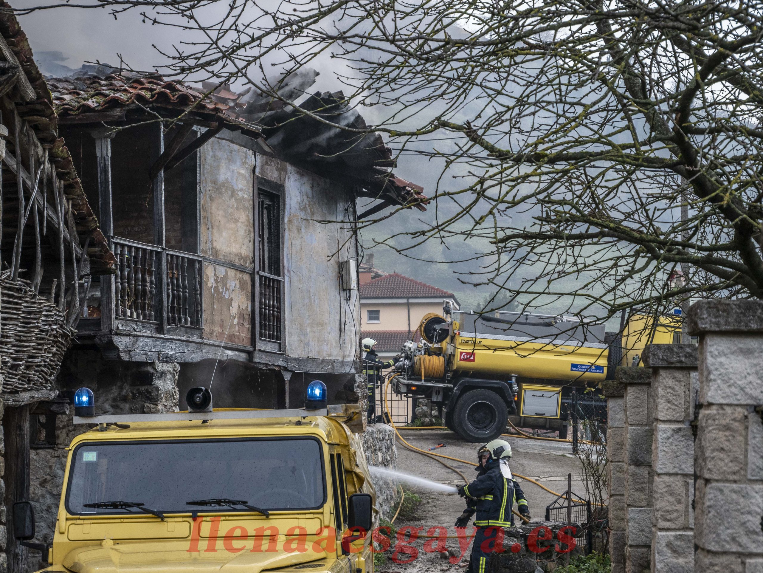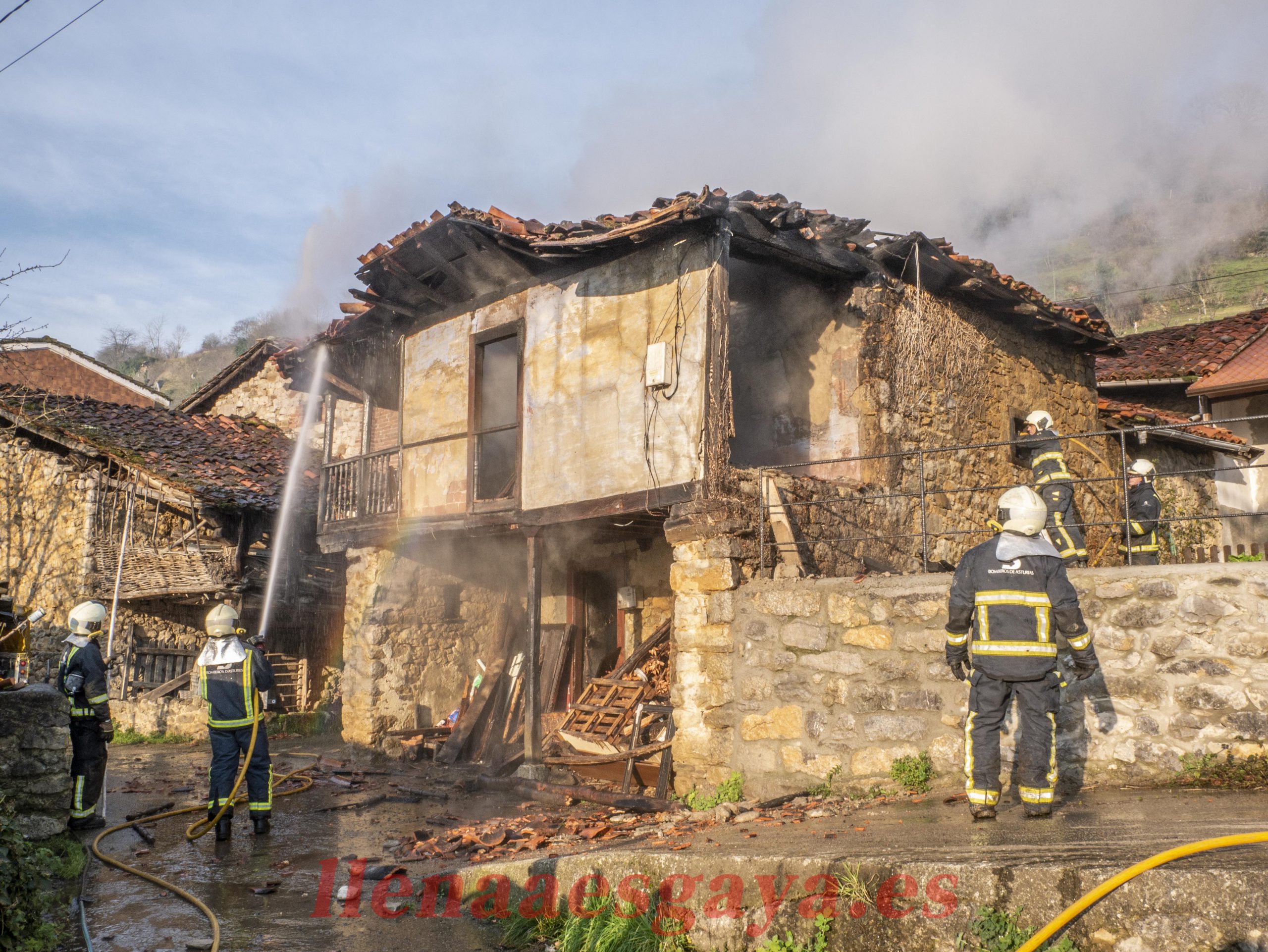 Una vez en el lugar, los efectivos se encontraron con el incendio totalmente desarrollado. Las llamas provocaron la caída del piso intermedio de la casa, de dos plantas, y del tejado. La dotación se centró en atacar las llamas, desde el exterior, con tres líneas de agua, para evitar su extinción y evitar su propagación a las construcciones colindantes. Al igual que en el segundo incendio, los Bomberos destacaron la colaboración de los vecinos, que en el pueblo cuentan con una manguera de la asociación, y cuya actuación fue crucial para evitar males mayores
