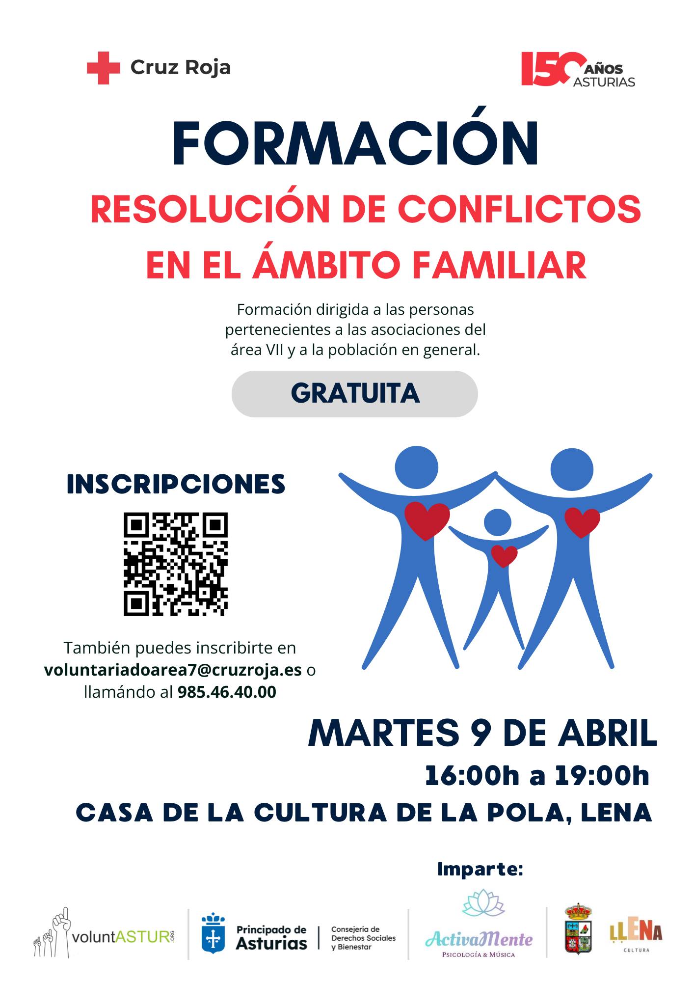 Bajo la organización de Cruz Roja – Centro de Voluntariado y Participación Social del Área VII, el próximo martes 9 de abril ActivaMente impartirá en la Casa de la Cultura de La Pola la formación «Resolución de Conflictos en el Ámbito Familiar«.