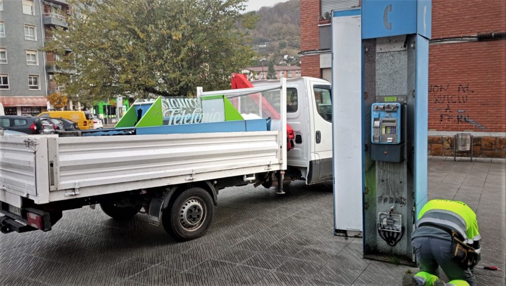 Operarios retiraban esta mañana una de las pocas cabinas que quedaban en pie. Y es que a lo largo de este 2022 Telefónica está retirando todas las cabinas que aún mantenía, con la llegada de la Ley General de Telecomunicaciones, que estableció que ya no son un servicio obligatorio. Las cabinas, así como las guías telefónicas, dejan de existir al considerarse «obsoletas«.
