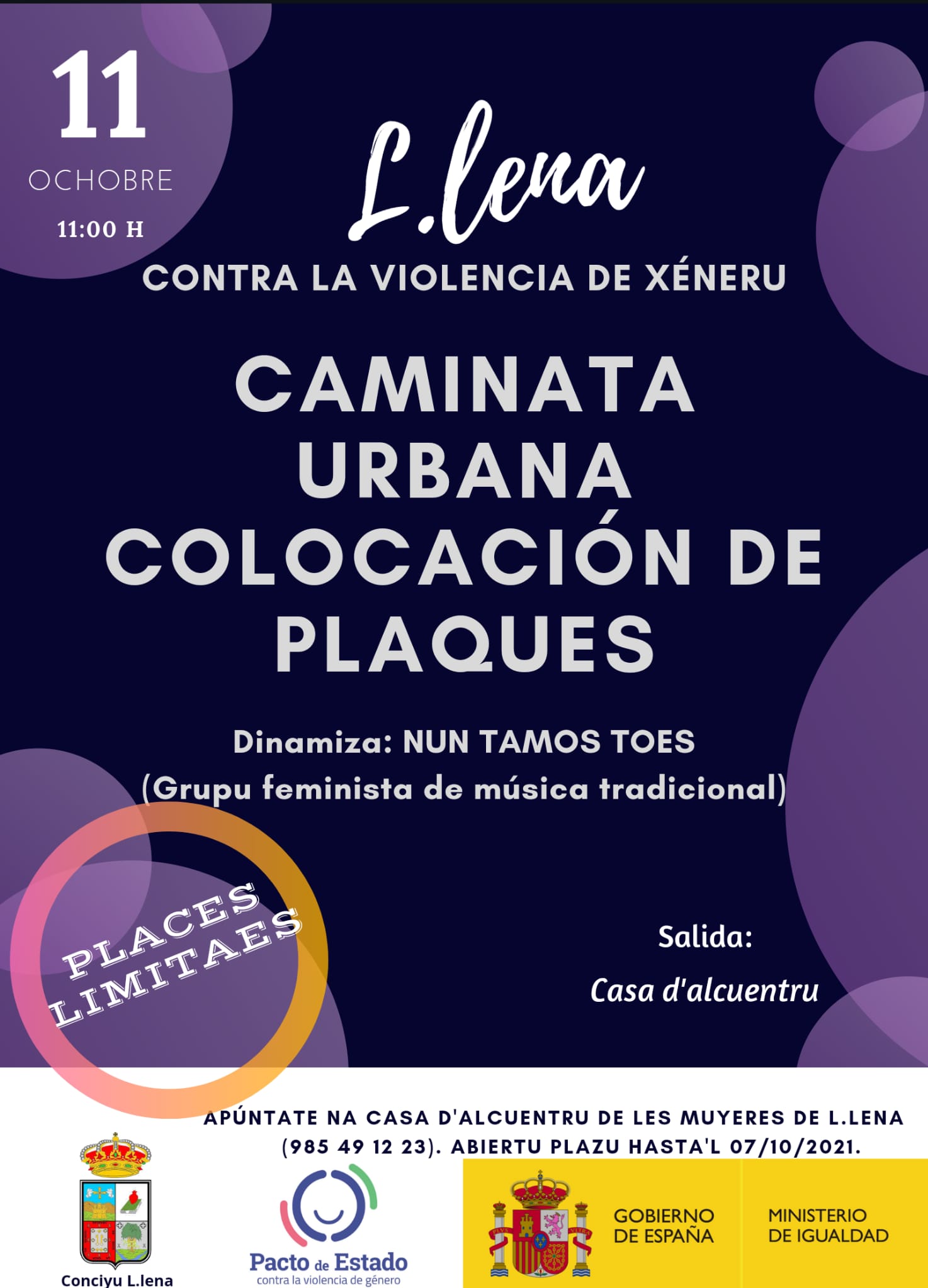 El próximu llunes 11, festivu local, va entamase una caminata contra la violencia de xéneru, amás, durante la marcha, va realizase unu allugamientu de plaques en diversos edificios públicos. Ye una actividá que va sirvir para sensibilizar y concenciar sobro la violencia de xéneru.