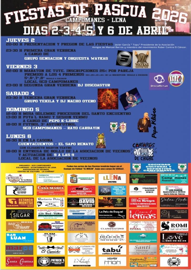 La localidad de Campomanes (Lena) celebrará del 2 al 6 de abril sus tradicionales Fiestas de Pascua 2026, con un programa que combina verbenas, actividades culturales, tradición y propuestas para todas las edades.