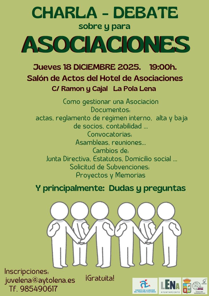 El próximo jueves 18 de diciembre, a las 19:00 horas, el Salón de Actos del Hotel de Asociaciones (calle Ramón y Cajal, La Pola) acogerá una charla–debate dirigida a todas aquellas personas que formen parte de una asociación o que estén pensando en crear una nueva entidad.