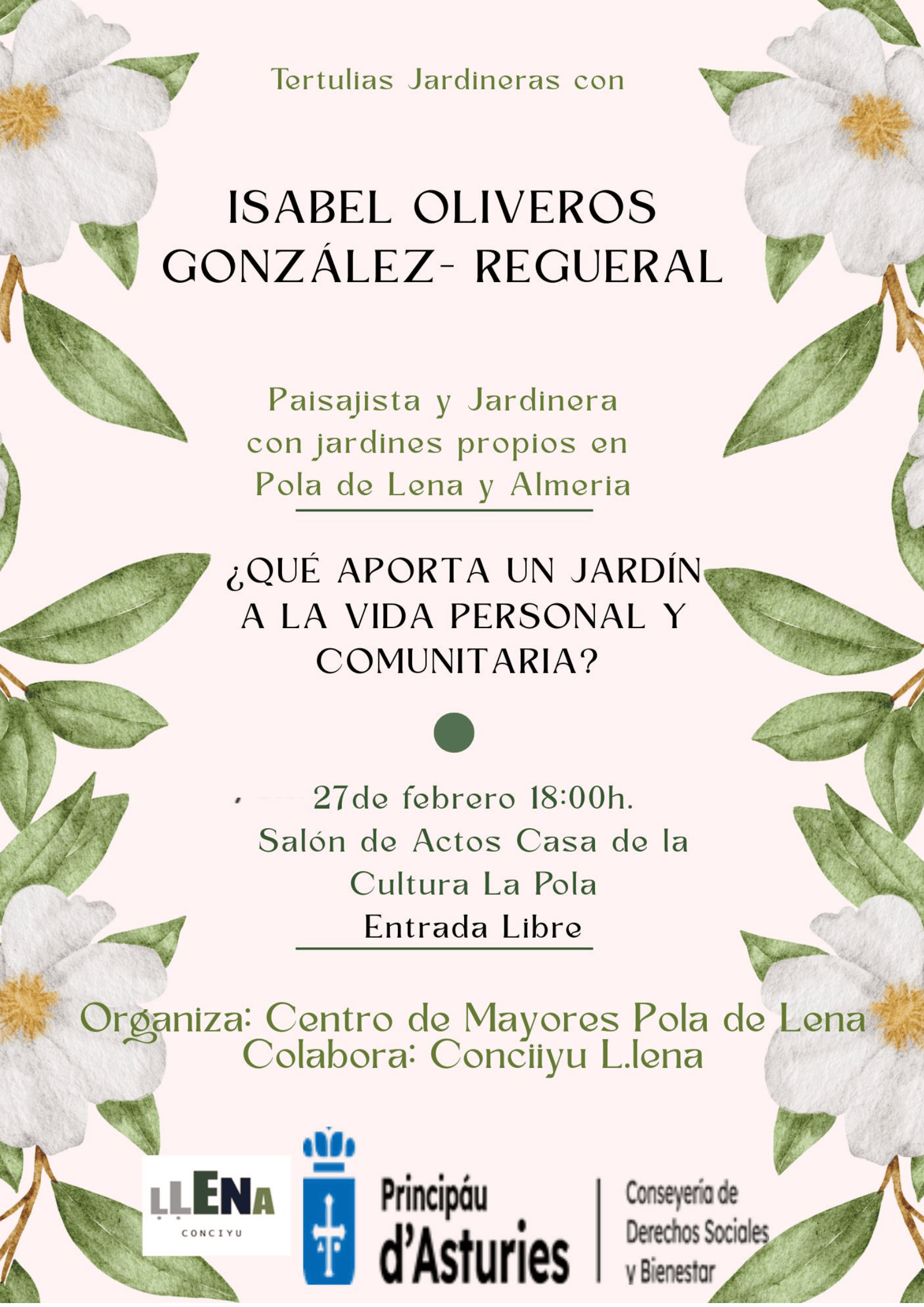 El próximo 27 de febrero a las 18:00 horas, el Salón de Actos de la Casa de la Cultura de La Pola acogerá una tertulia bajo el título “¿Qué aporta un jardín a la vida personal y comunitaria?”, con la intervención de la paisajista y jardinera Isabel Oliveros González-Regueral.