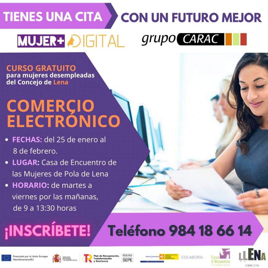Se trata de una formación que ofrece el grupoCARAC, bajo el programa de ‘Mujer más digital‘, que forma parte del Servicio Público de Empleo, es financiada por la Unión Europea a través de los fondos NextGenerationEU y cuenta con la colaboración del Ayuntamiento de Lena/Ḷḷena. Para optar a dicha formación es necesario estar inscrita como demandante de empleo.