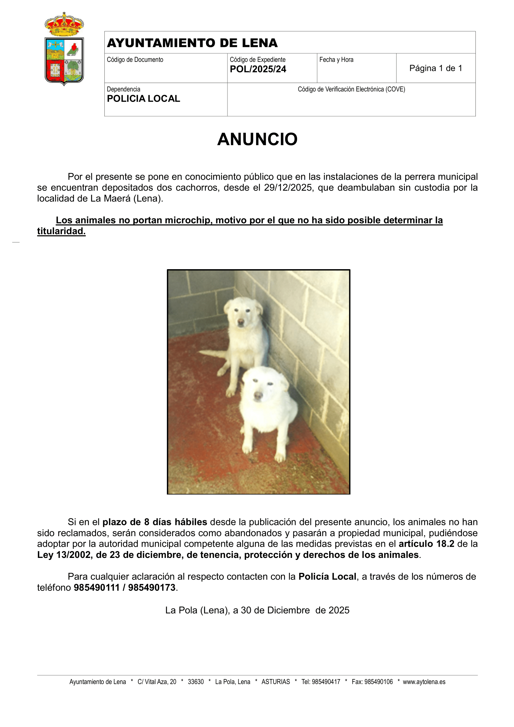 La Policía Local de Lena ha informado de la recogida de dos cachorros que se encontraban deambulando sin custodia por la localidad de La Maerá, dentro del concejo de Lena. Los animales fueron trasladados a la perrera municipal el pasado 29 de diciembre de 2025, donde permanecen desde entonces.