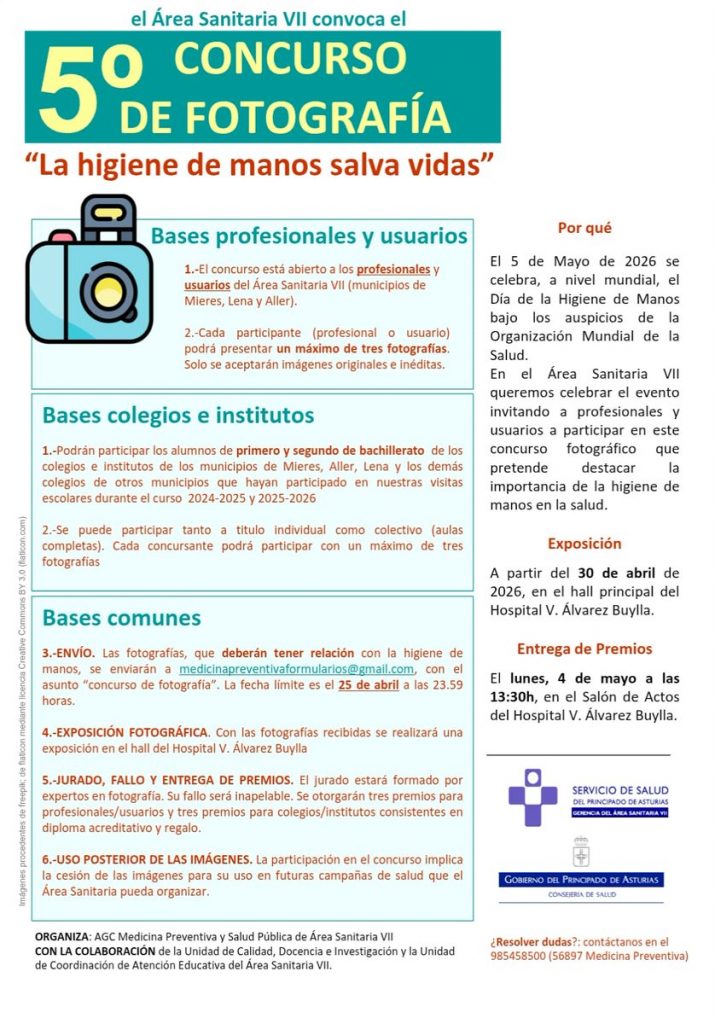 El Área Sanitaria VII, con sede en el Hospital Vital Álvarez Buylla de Mieres, ha convocado la quinta edición del Concurso de Fotografía “La higiene de manos salva vidas”, una iniciativa que busca concienciar sobre la importancia de este hábito en la salud.
