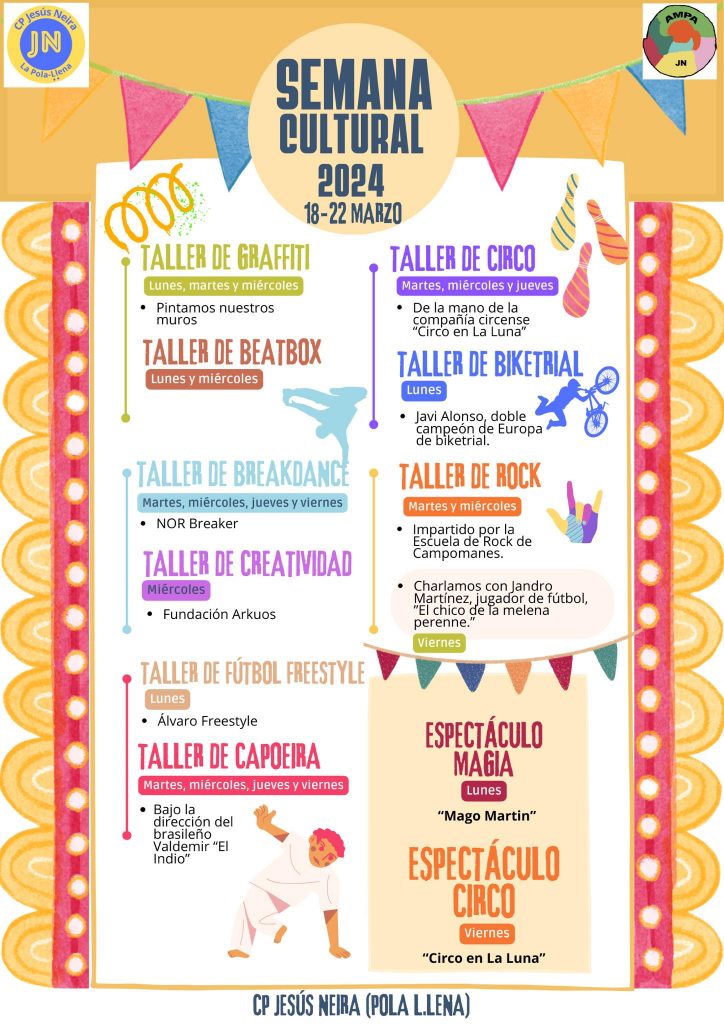 Un C.P. Jesús Neira que, por cierto, este curso también estrenará himno, pero centrándonos en la semana cultural, las actividades se celebrarán tanto en el centro como en la Plaza Alfonso X El Sabio. Los muros del C.P. Jesús Neira tomarán color el lunes, martes y miércoles con su taller de graffiti. El lunes y el martes los alumnos del centro también disfrutaran de un taller de beatbox. El mismo lunes se celebrará un gran espectáculo de magia de la mano de ‘Mago Martin’, al que están invitadas todas las familias con niños de 2-3 años.
