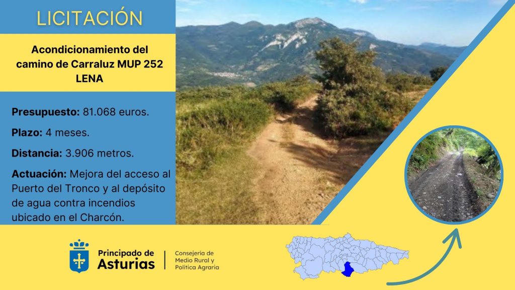 La Consejería de Medio Rural y Política Agraria ha sacado a licitación por 81.068 euros las obras de acondicionamiento del camino de Carraluz, en el concejo de Lena, una actuación que permitirá mejorar el acceso al monte de utilidad pública número 252, conocido como Puerto del Tronco, así como al depósito de agua contra incendios del paraje de El Charcón.