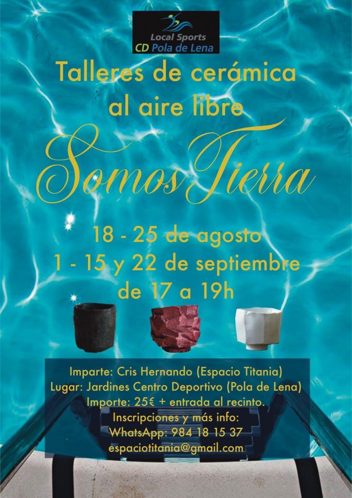 Los Jardines del Centro Deportivo de Pola de Lena se convertirán en un espacio creativo los días 18 y 25 de agosto, así como 1, 15 y 22 de septiembre, con la celebración de los talleres de cerámica al aire libre “Somos Tierra”, organizados por Cris Hernando (Espacio Titania).