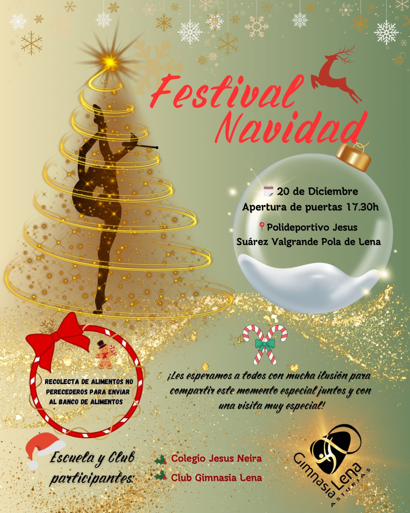 El Club Gimnasia Lena celebrará el próximo viernes 20 de diciembre su Festival de Navidad en el Polideportivo de Pola de Lena, en una cita pensada para el disfrute de las familias y con un marcado carácter solidario. La entrada al pabellón se abrirá a las 17:30 horas, y el inicio del festival está previsto para las 17:45 horas.