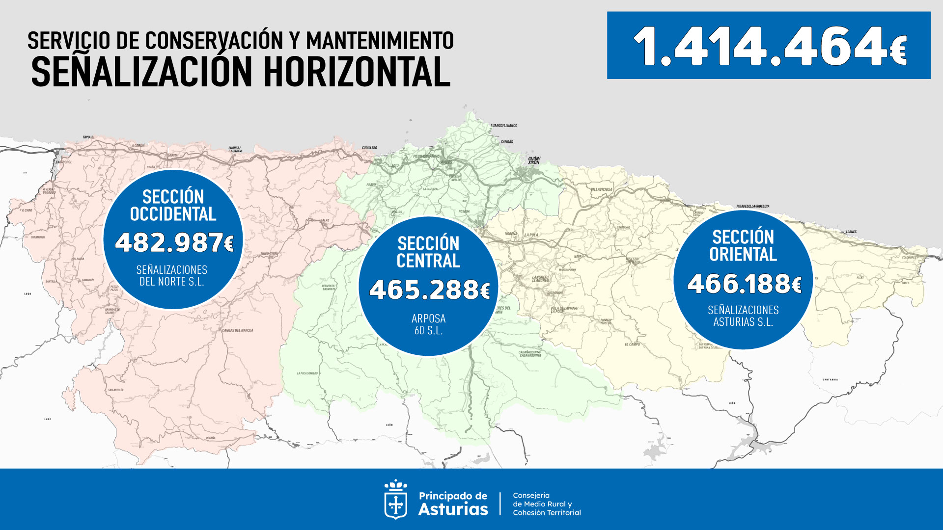 El Gobierno de Asturias ha dividido los servicios de mejora de la señalización horizontal en tres lotes: oriental, central y occidental. El primero de ellos se ha adjudicado a la empresa Señalizaciones Asturias S.L., por 466.188 euros; el segundo a Arposa 60 S.L., por 465.288.34 y el tercero, a Señalizaciones del Norte S.L., por 482.987 euros. En todos los casos los contratos tienen un plazo de ejecución de 30 meses y su presupuesto se divide en las anualidades de 2023, 2024 y 2025.