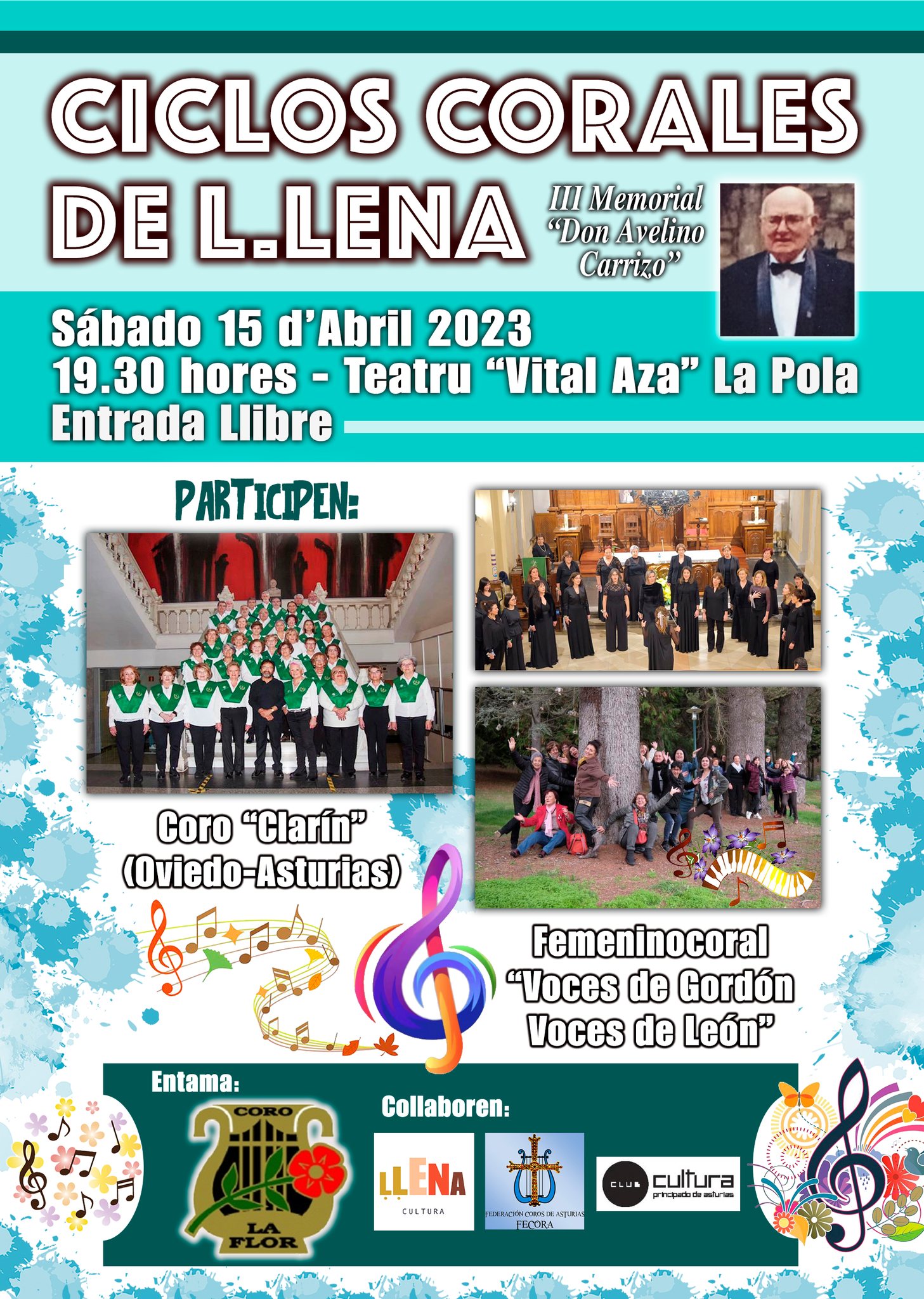 El Teatro Vital Aza de La Pola pondrá escenario el próximo sábado 15 de abril a una nueva edición de los Ciclos Corales de Ḷḷena «III Memorial Avelino Carrizo», con entrada libre, a partir de las siete y media de la tarde. El evento se incluirá en la programación de las fiestas de La Flor.