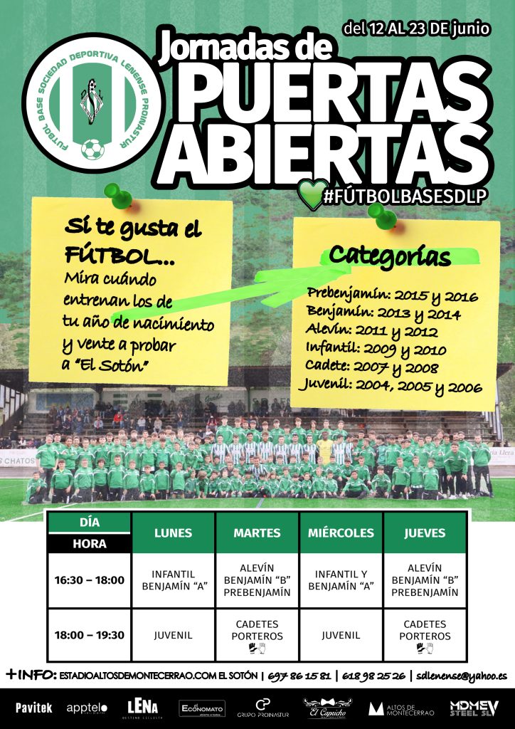 El Área de Fútbol Base de la Sociedad Deportiva Lenense Proinastur anuncia que organizará, en las dos semanas de entrenamientos que comprende el periodo entre el 12 y el 23 del presente mes de junio, unas Jornadas de Puertas Abiertas «para que los niños de cualquier edad a los que les guste el Fútbol puedan acudir al Estadio ALTOSDEMONTECERRAO.COM – El Sotón a vivir la experiencia de estar enrolados en la dinámica de los equipos federados del Club«, apuntan desde el Lenense Proinastur.