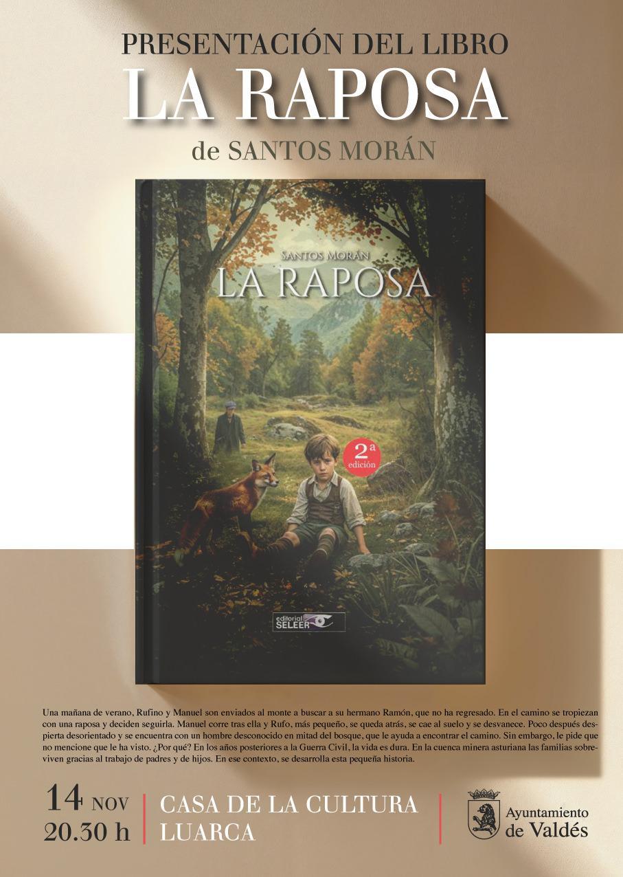 El escritor lenense Santos Morán presentará este viernes 14 de noviembre, a las 20:30 horas, su novela “La raposa” en la Casa de la Cultura de Luarca, en Valdés. El acto cuenta con entrada libre hasta completar aforo.