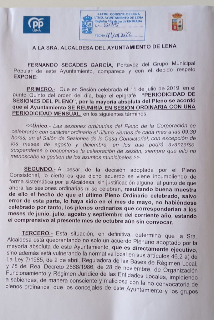 Los populares de Lena instan a convocar plenos y «cumplir con la legalidad» y afirman, «caso de no convocarse las sesiones plenarias ordinarias de este Ayuntamiento, tal y como fueron acordadas en el pleno de organización celebrado el 11 de julio de 2019, esta parte se verá obligado al ejercicio de las judiciales, tanto contenciosas como penales, a que haya lugar en defensa de sus derechos como concejal«.