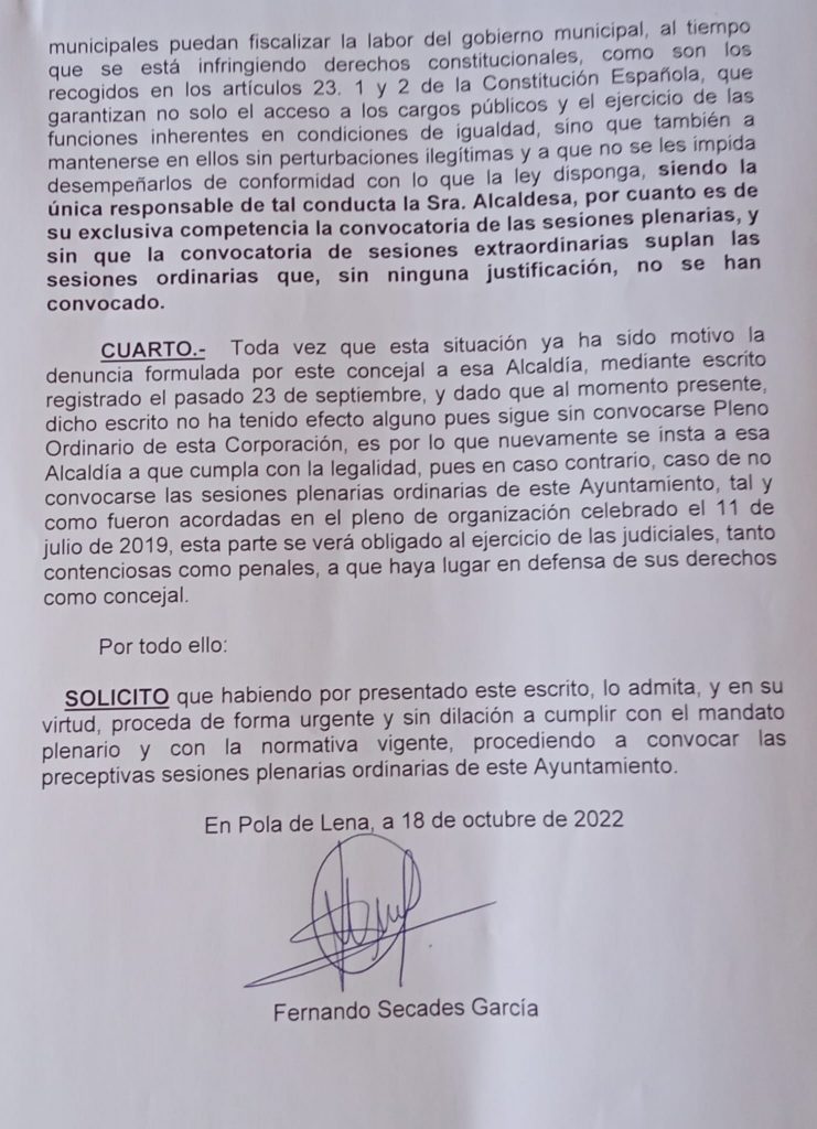Fernando Secades García finaliza el escrito solicitando que se «proceda de forma urgente y sin dilación a cumplir con el mandato plenario y con la normativa vigente, procediendo a convocar las preceptivas sesiones plenarias ordinarias de este Ayuntamiento«.
