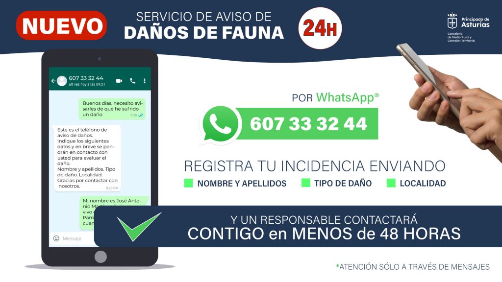La Consejería de Medio Rural y Cohesión Territorial ha puesto en marcha un nuevo servicio de atención 24 horas para notificar los daños producidos por la fauna silvestre. El servicio de avisos utiliza la aplicación de mensajería WhatsApp, permite una atención rápida y facilita que las personas comuniquen un daño a través del teléfono 607 333 244.