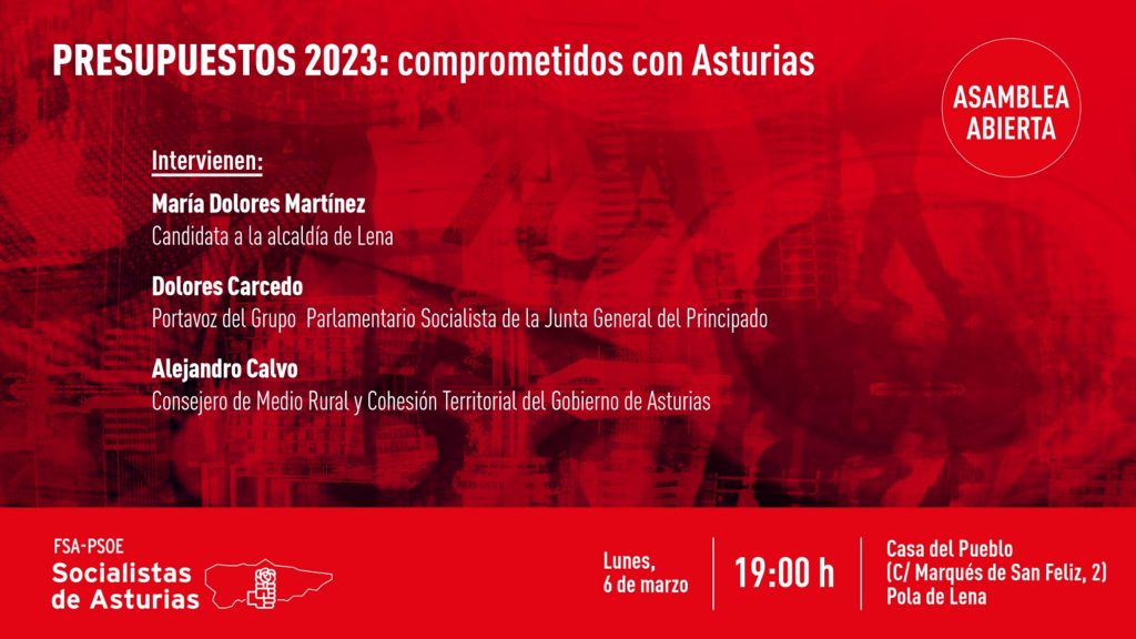 Desde el PSOE de Lena se invita «¿Quieres saber más sobre los Presupuestos Asturias 2023? ¡Ven a nuestra asamblea abierta y resuelve tus dudas!«.