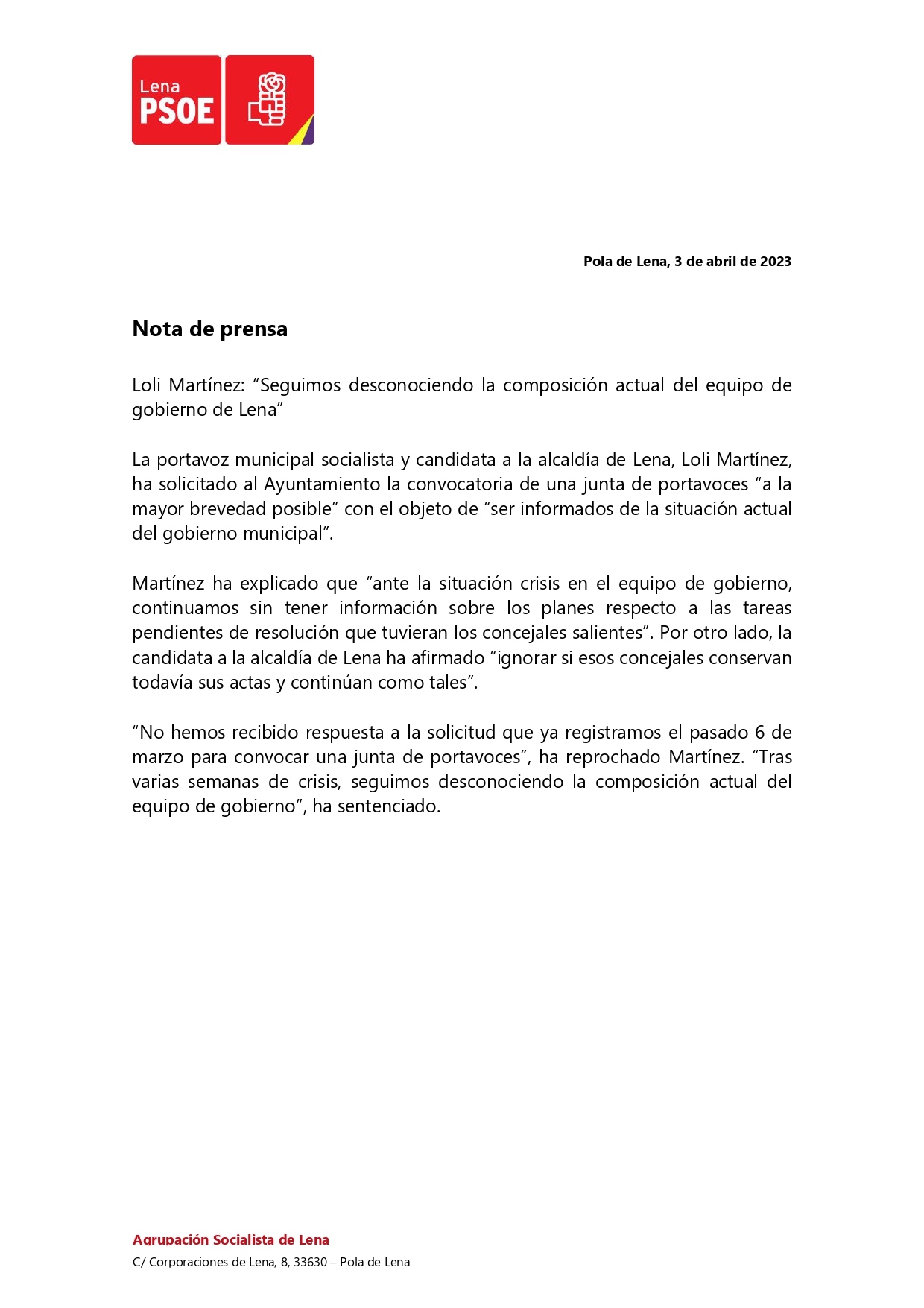 El PSOE de Lena ya había registrado esa solicitud a principios del mes pasado, recuerda Loli Martínez en la nota de prensa que «no hemos recibido respuesta a la solicitud que ya registramos el pasado 6 de marzo para convocar una junta de portavoces» y afirma que «tras varias semanas de crisis, seguimos desconociendo la composición actual del equipo de gobierno«.