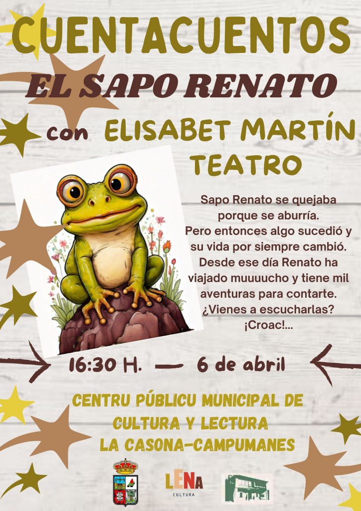 Las Fiestas de Pascua de Campomanes incluirán en su programación una propuesta dirigida al público infantil con el cuentacuentos “El sapo Renato”, que se celebrará el lunes 6 de abril a las 16:30 horas.