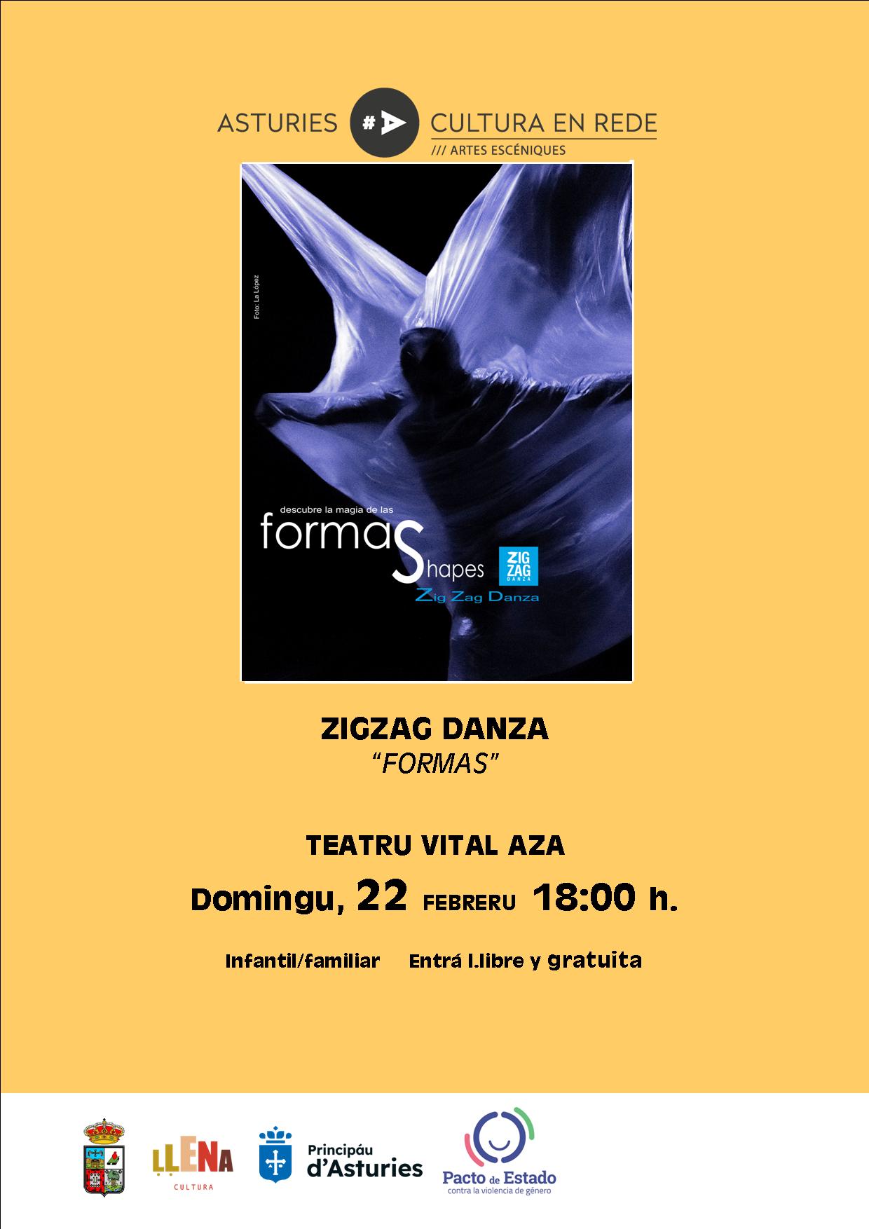 El Teatro Vital Aza de La Pola ofrecerá este domingo 22 de febrero, a las 18:00 horas, el espectáculo “Formas”, a cargo de la compañía asturiana Zig Zag Danza. La entrada será libre y gratuita hasta completar aforo.