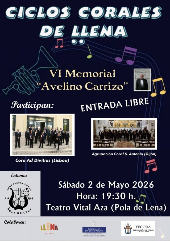 La música coral será protagonista en Pola de Lena este sábado 2 de mayo con la celebración del VI Memorial “Avelino Carrizo”, incluido dentro de los Ciclos Corales de Lena. El concierto tendrá lugar a las 19:30 horas en el Teatro Vital Aza, con entrada libre, en una cita que reunirá a agrupaciones de ámbito nacional e internacional.