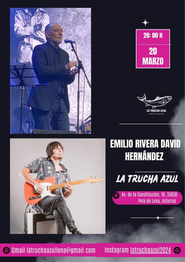 El espacio cultural La Trucha Azul, en Pola de Lena, acogerá este jueves 20 de marzo a las 20:00 horas una actuación musical protagonizada por Emilio Rivera y David Hernández.