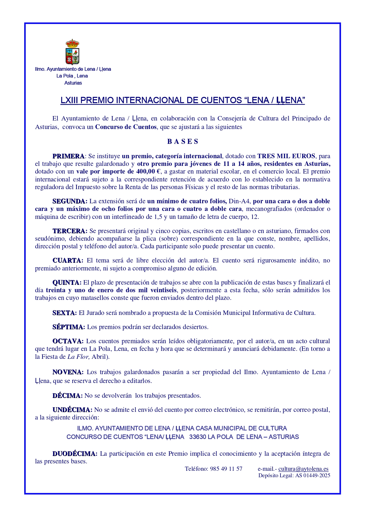 El Ayuntamiento de Lena / Ḷḷena ha convocado la 63ª edición del Premio Internacional de Cuentos “Lena / Ḷḷena”, un certamen literario de larga trayectoria que cuenta con el respaldo de la Consejería de Cultura del Principado de Asturias. La presente convocatoria incluye un premio internacional dotado con 3.000 euros, además de un premio para jóvenes asturianos de 11 a 14 años, con un vale de 400 euros para material escolar.