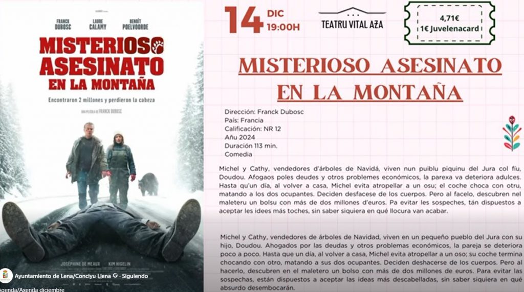 El Teatro Vital Aza acogerá este domingo 14 de diciembre, a las 19:00 horas, la proyección de la película “Misterioso asesinato en la montaña”, una comedia francesa dirigida por Franck Dubosc y estrenada en 2024. La entrada tendrá un precio de 4,71 euros, con tarifa reducida de 1 euro para quienes dispongan de la Juvelenacard.