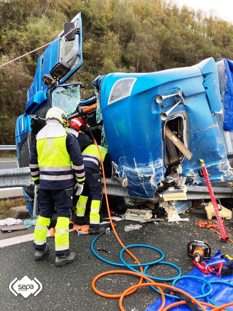 El hombre tuvo que ser excarcelado del interior de la cabina por efectivos de Bomberos del Servicio de Emergencias del Principado de Asturias (SEPA) con base en el parque de Mieres y el jefe de zona centro. Las labores de rescate resultaron dificultosas al estar sobre el quitamiedos y se prolongaron más de una hora. El hombre se encontraba atrapado por las piernas y para poder liberarlo se tuvieron que utilizar dos equipos de excarcelación para cortar la parte delantera de la cabina y poder sacar el volante hacia el exterior. En el vehículo viajaba otra persona que salió por sus medios del interior y resultó ilesa.