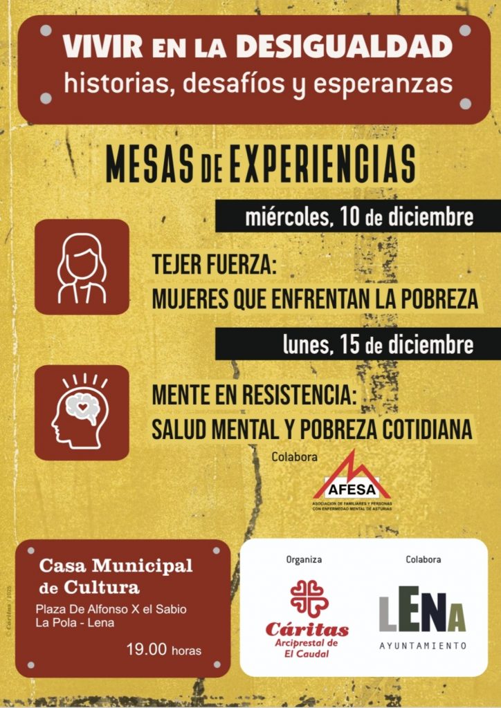 La Casa Municipal de Cultura de La Pola acogerá los días 10 y 15 de diciembre dos mesas de experiencias centradas en la desigualdad, la pobreza y la salud mental, dentro del ciclo “Vivir en la desigualdad: historias, desafíos y esperanzas”, organizado por Cáritas Arciprestal de El Caudal con la colaboración del Ayuntamiento de Lena y la entidad AFESA.
