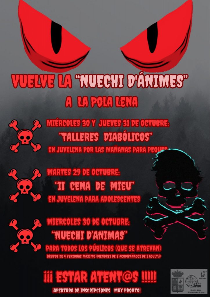 Un año más desde la OIJ Juvelena se programan diferentes actividades coincidiendo con la ‘nuechi d’animes’ (también conocida como ‘hallowen’ o ‘samaín’). Las actividades incluyen el campamento de respiro familiar con los talleres diabólicos el miércoles 30 y jueves 31 de octubre en Juvelena por las mañanas en las 10:30 y las 13:30h., con plazas para 25 peques de 4 a 9 años.