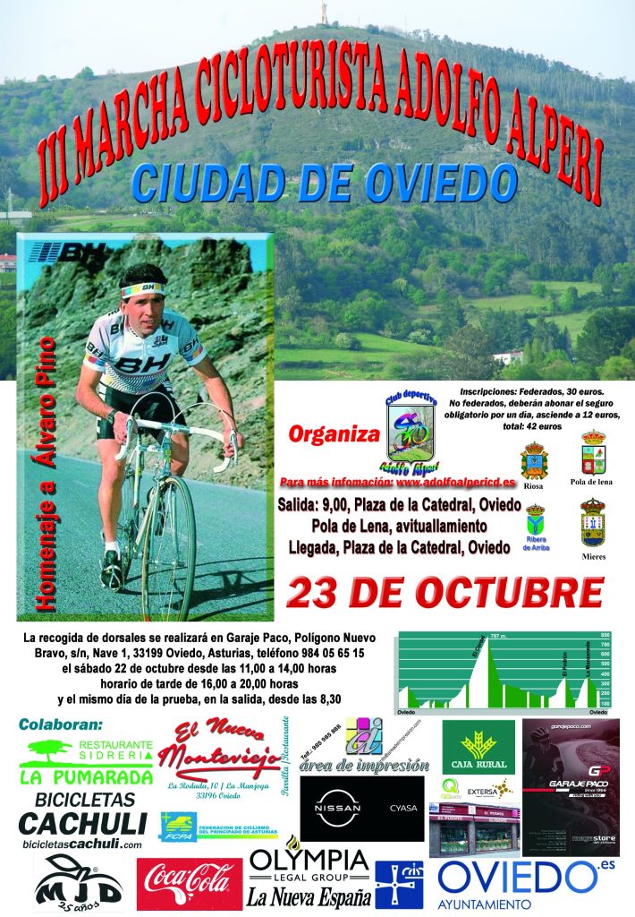 Con salida desde La Catedral de Oviedo, la prueba pasará por Soto de Ribera, La Vega, Alto del Cordal, Pola de Lena, Ujo, Mieres, Rebollada, Alto del Padrun, Olloniego, Manzaneda, San Esteban y volverá a Oviedo. La marcha cicloturista no es competitiva y ha sido autorizada por la Federación Asturiana de Ciclismo.