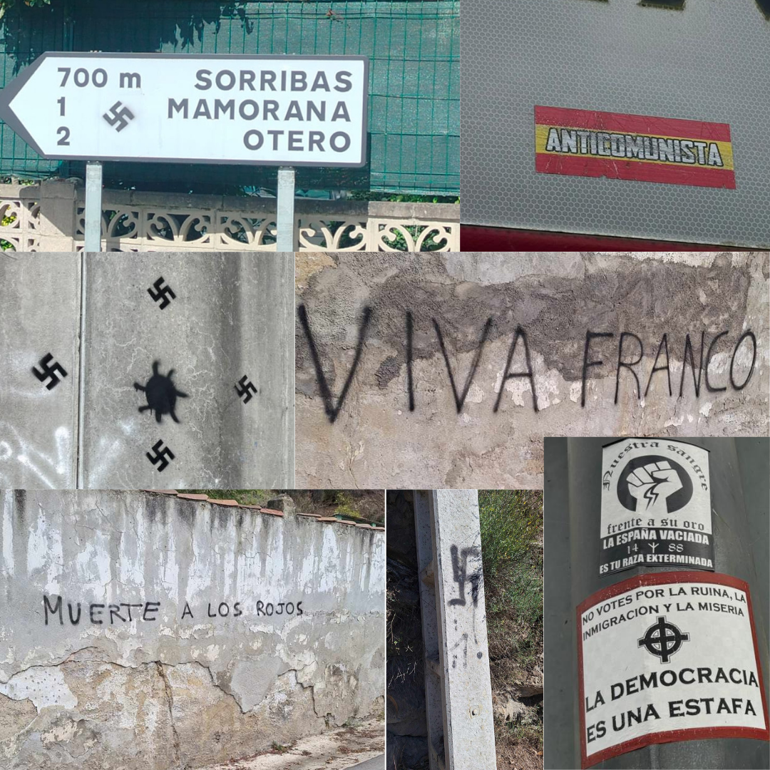Se llegan a observar esvásticas pintadas a mano, símbolos nazis realizados con plantillas y expresiones como “Viva Franco”, “Arriba España” o “Muerte a los rojos”, además, en determinados lugares se han colocado incluso pegatinas con cruces celtas o iconografía de movimientos fascistas contemporáneos, así como mensajes de odio ideológico y xenófobo.
