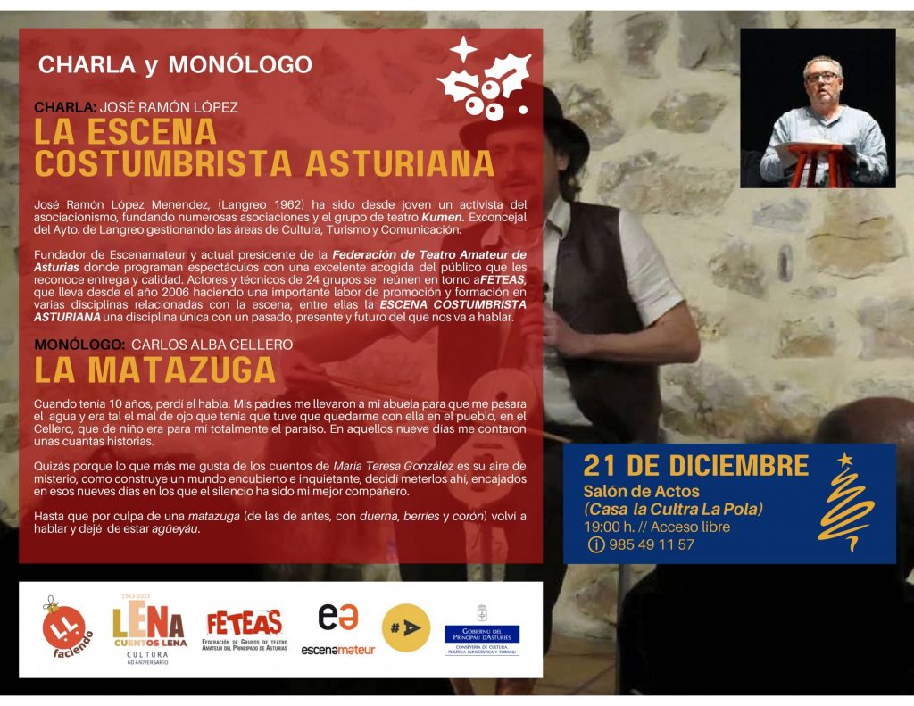 Tras la charla, será el turno del reputado Carlos Alba Cellero, que presentará el monólogo «La Matazuga«. La sinopsis, ofrecida por Asturies, Cultura en Rede, es la siguiente: