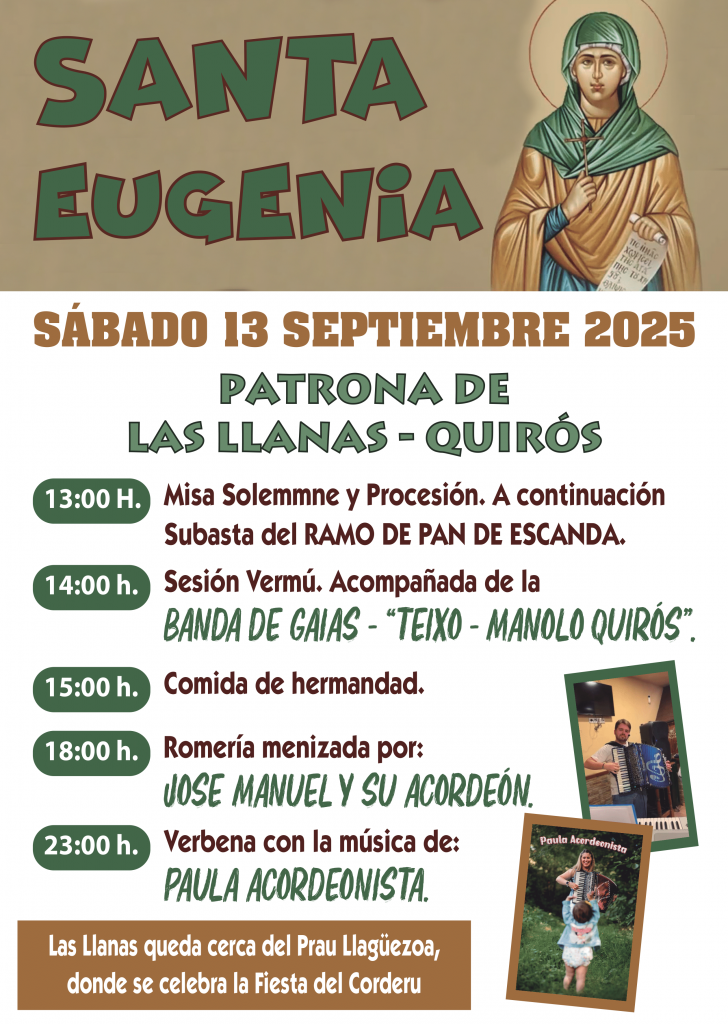 Las Llanas, situado muy cerca del Prau Llagüezos, escenario de la emblemática Fiesta del Corderu compartida entre Lena y Quirós, celebrará el sábado 13 de septiembre las fiestas en honor a Santa Eugenia, patrona del pueblo.