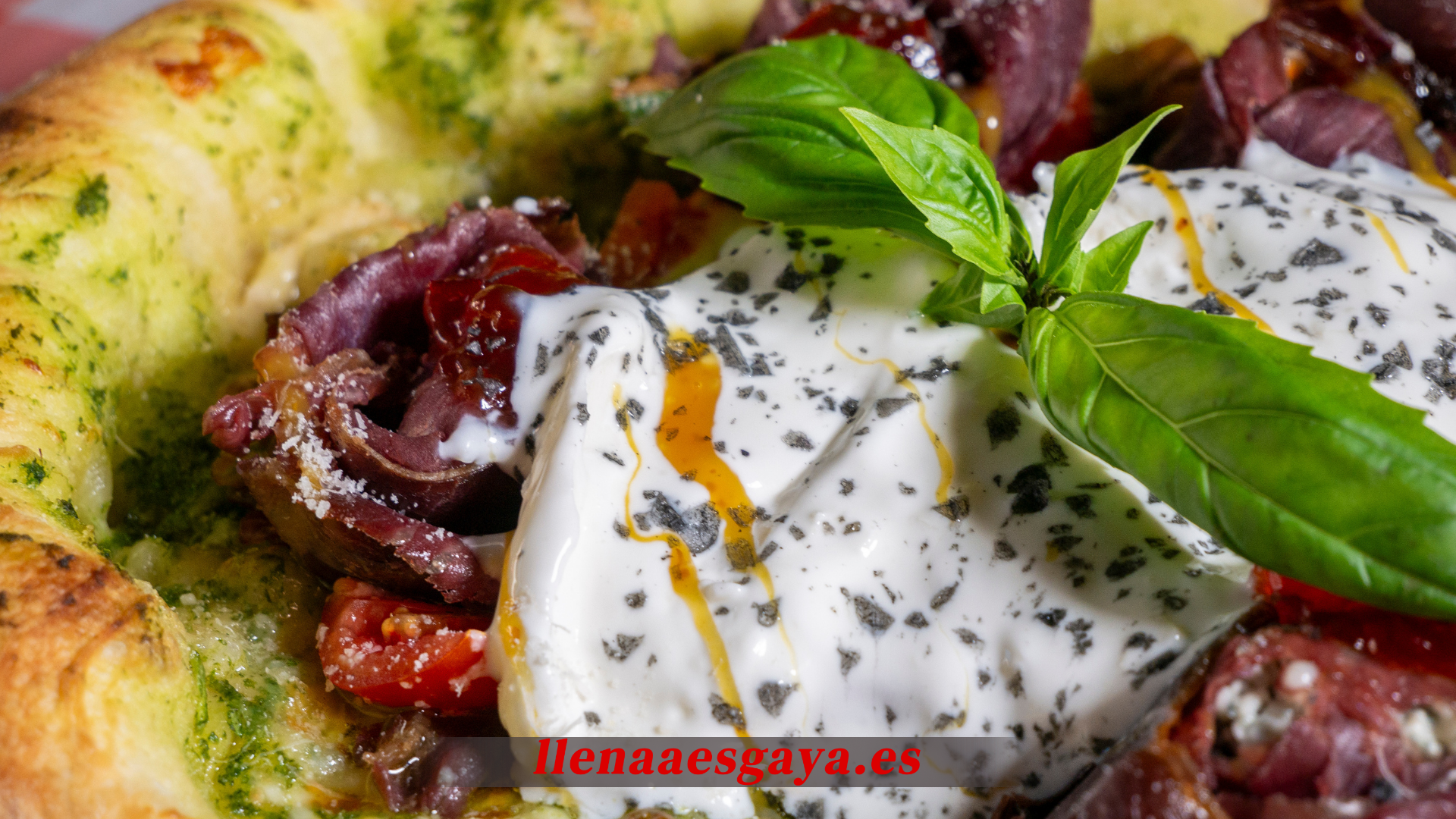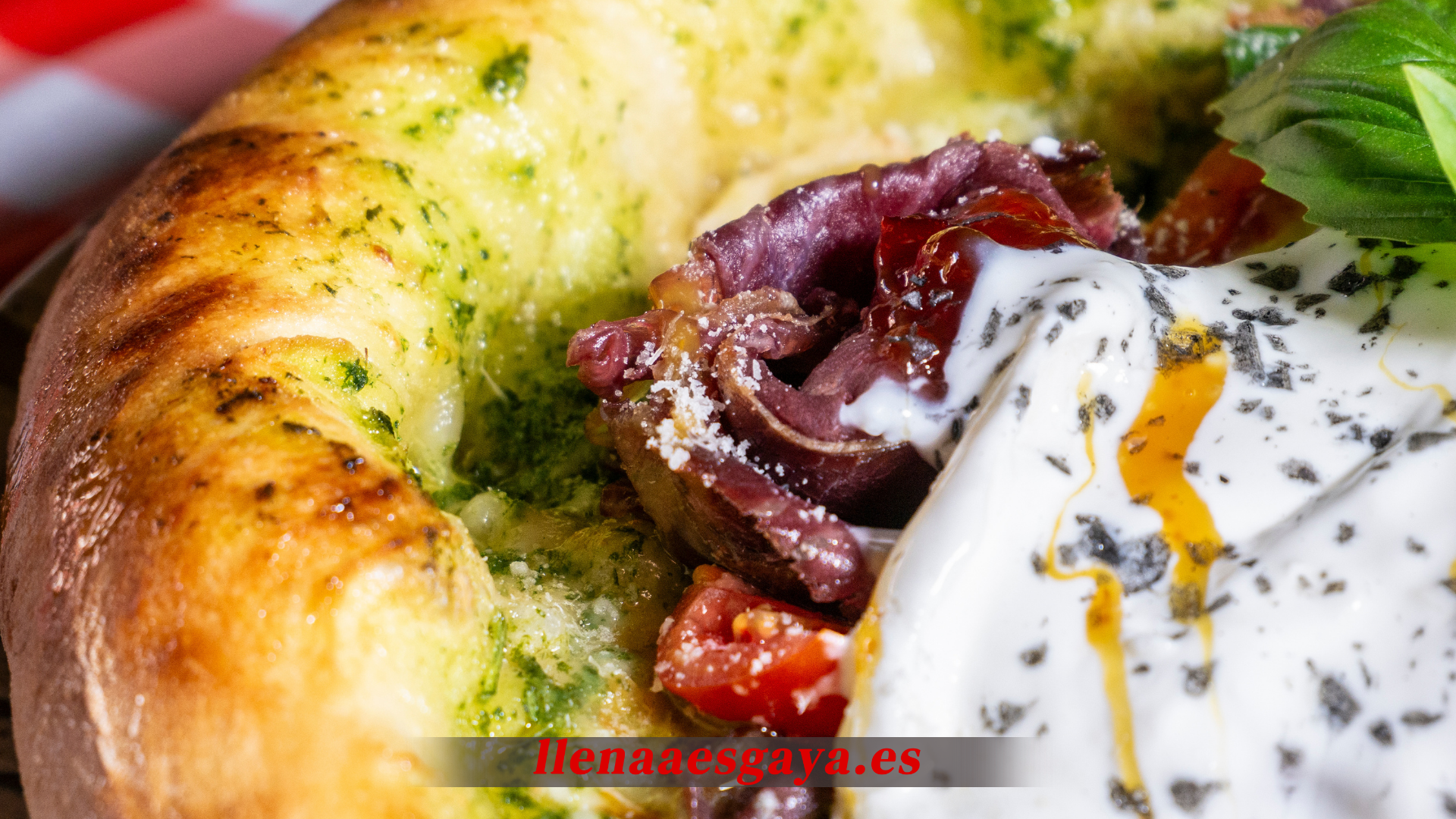 Ingredientes: masa fermentada durante 72 horas, pesto de rúcula, mozzarella con queso de cabra, tortellini relleno de cabrales, mermelada de piquillo y jalapeños, aceite de pesto y parmesano.