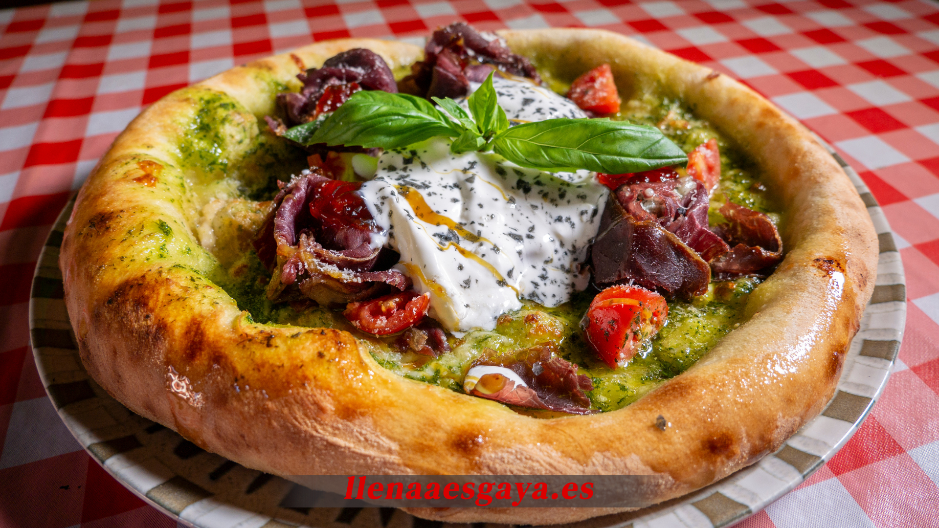 “Partimos de una base napolitana con mozzarella fior di latte, coronada por tortellinis de cecina rellenos de queso cabrales, mermelada de piquillo y jalapeño, y finalizada con reducción de mostaza y miel, pesto y chimichurri de albahaca. Una pizza que une tres tierras y explota en sabor”, señalan.