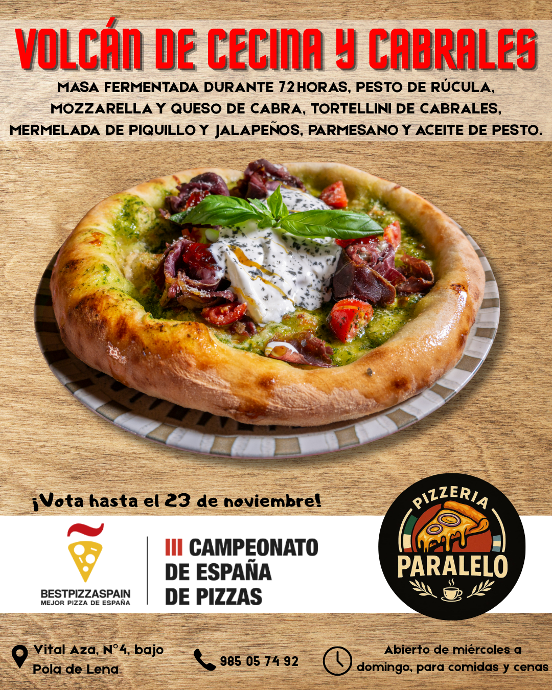 La votación popular para elegir La Mejor Pizza de España® estará abierta del 30 de octubre al 23 de noviembre, y puede realizarse a través de la web oficial del certamen. Pizzería Paralelo se consolida así como un referente de creatividad y calidad en la hostelería lenense, llevando el nombre de Pola de Lena y de la Cuenca del Caudal al mapa nacional de la pizza.