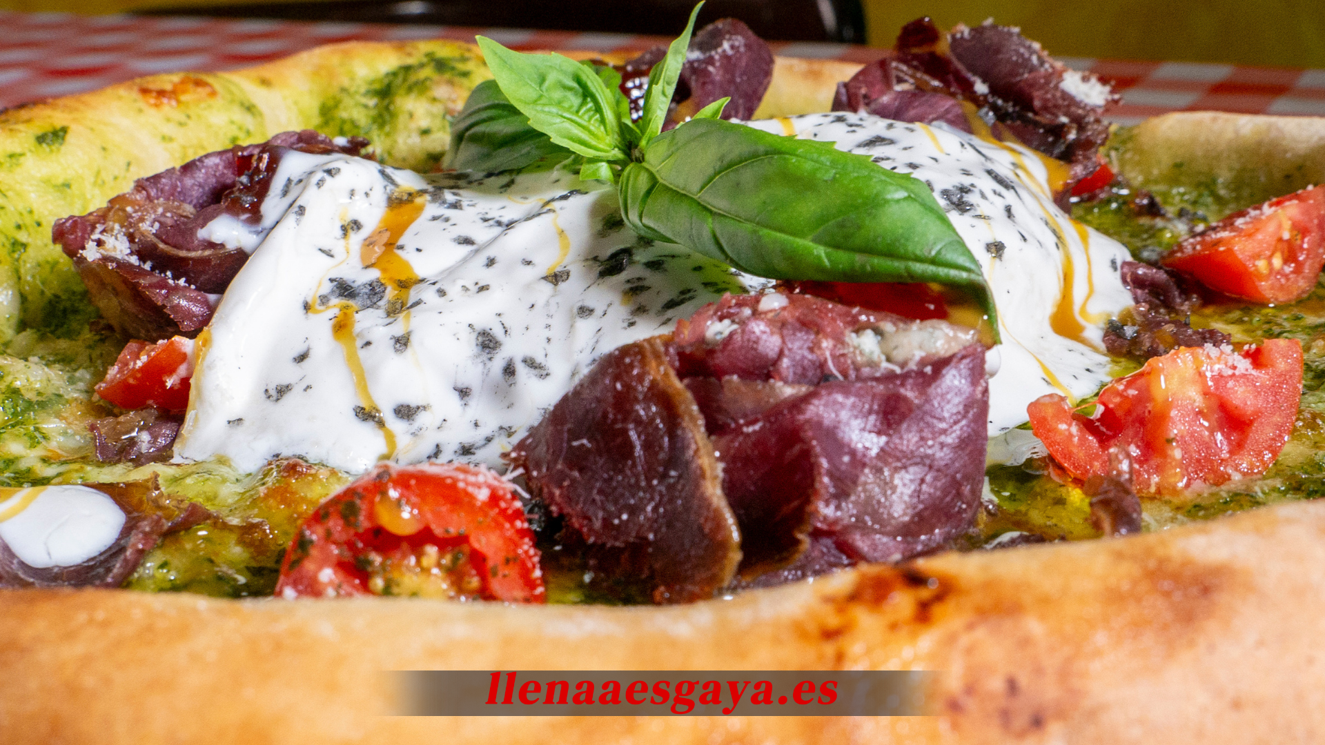 Ingredientes: masa fermentada durante 72 horas, pesto de rúcula, mozzarella con queso de cabra, tortellini relleno de cabrales, mermelada de piquillo y jalapeños, aceite de pesto y parmesano.