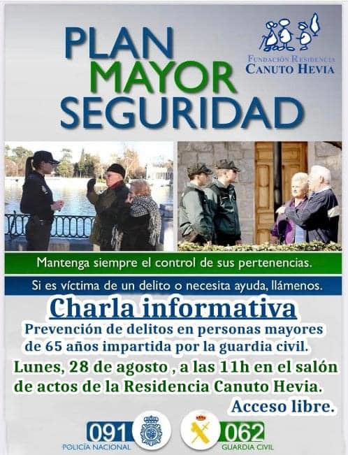 Con acceso libre, la Residencia Canuto Hevia de La Pola acoge en la mañana de este lunes, 28 de agosto, una charla informativa que será impartida por la Guardia Civil, dentro de su Plan Mayor Seguridad en el que se ofrecen una serie de consejos prácticos, para un mayor bienestar de nuestras personas mayores. La charla va encaminada a la prevención de delitos en personas mayores de 65 años.