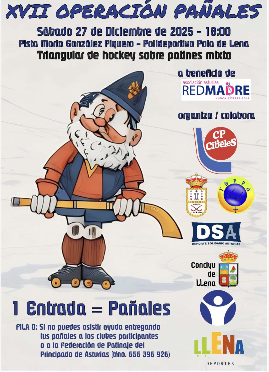 La XVII Operación Pañales regresa a Pola de Lena como una de las citas solidarias más consolidadas del calendario deportivo navideño. El evento se celebrará el sábado 27 de diciembre, a las 18:00 horas, en la Pista Marta González Piquero, dentro del Polideportivo de Pola de Lena, con un triangular mixto de hockey sobre patines.