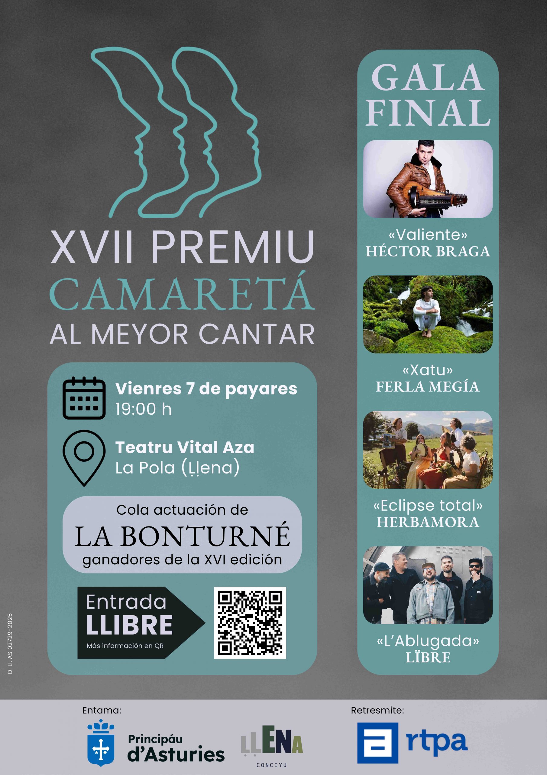 El Teatro Vital Aza de La Pola Lena será el escenario de la gala final del XVII Premiu Camaretá al Meyor Cantar, un certamen impulsado por la Consejería de Cultura, Política Llingüística y Deporte que reconoce la creación musical en asturiano y eonaviego. La cita tendrá lugar el viernes 7 de noviembre a las 19:00 horas, con entrada libre hasta completar aforo y retransmisión en directo por RTPA.