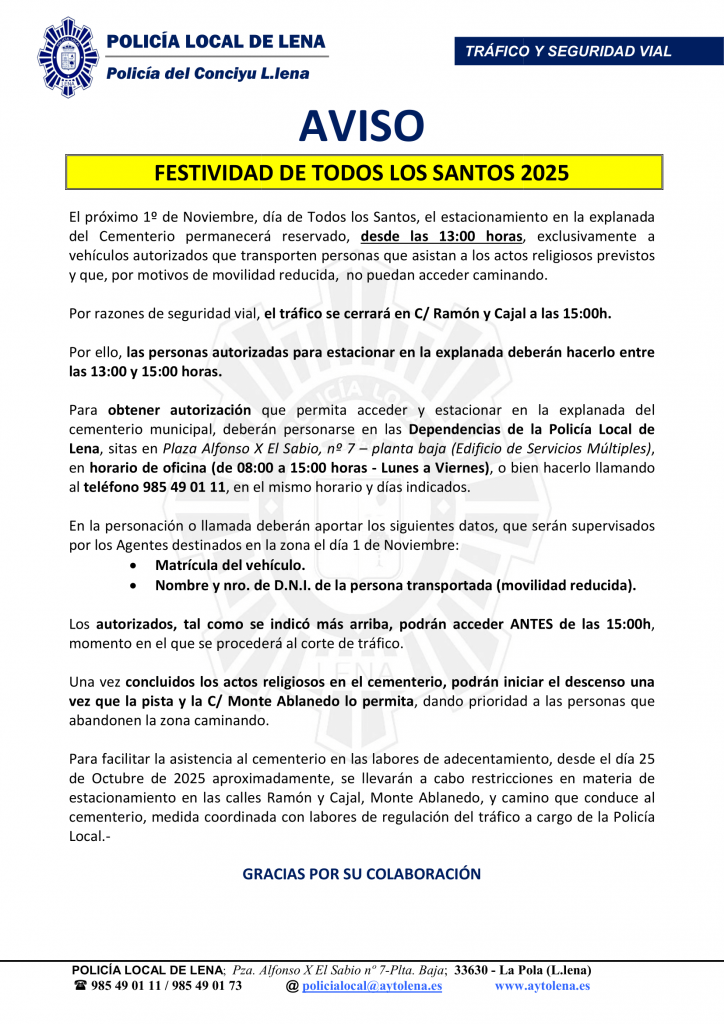 Con motivo de la festividad de Todos los Santos, la Policía Local de Lena ha anunciado un dispositivo especial de tráfico y seguridad vial en torno al cementerio municipal de La Pola, destinado a garantizar la seguridad y la fluidez de acceso durante la jornada del sábado 1 de noviembre.