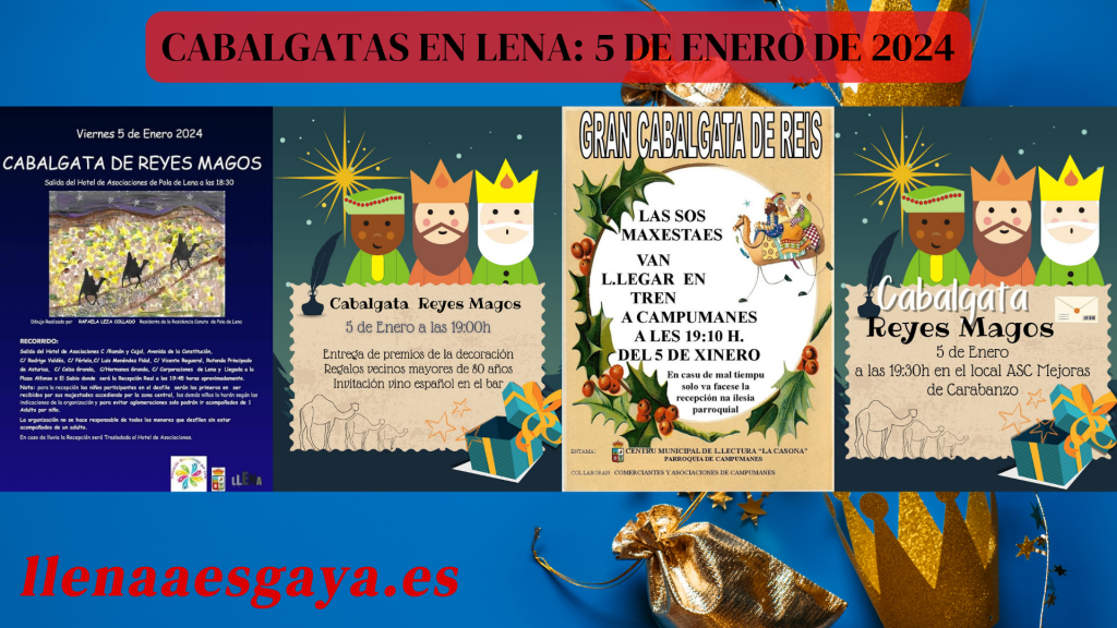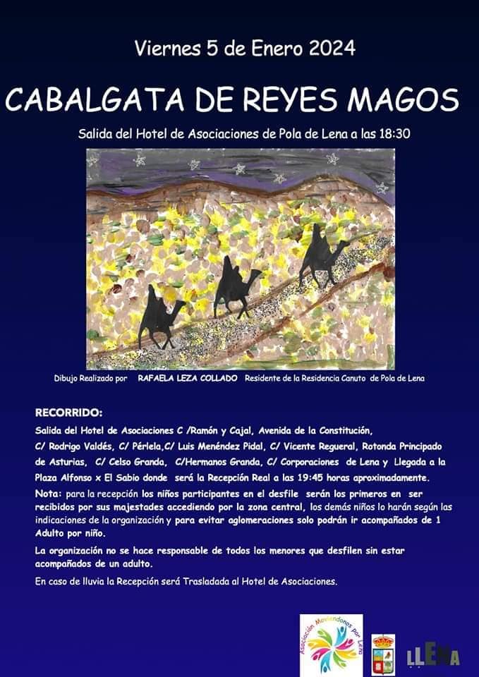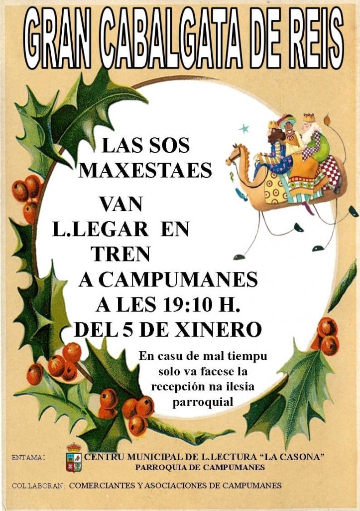 Sus majestades de Oriente visitarán, como no podría ser de otra forma, la segunda localidad más poblada de Lena. Llegaran en tren a las siete y diez de la tarde y realizarán un recorrido por la localidad. En caso de lluvia, se hará una recepción en la iglesia parroquial.
