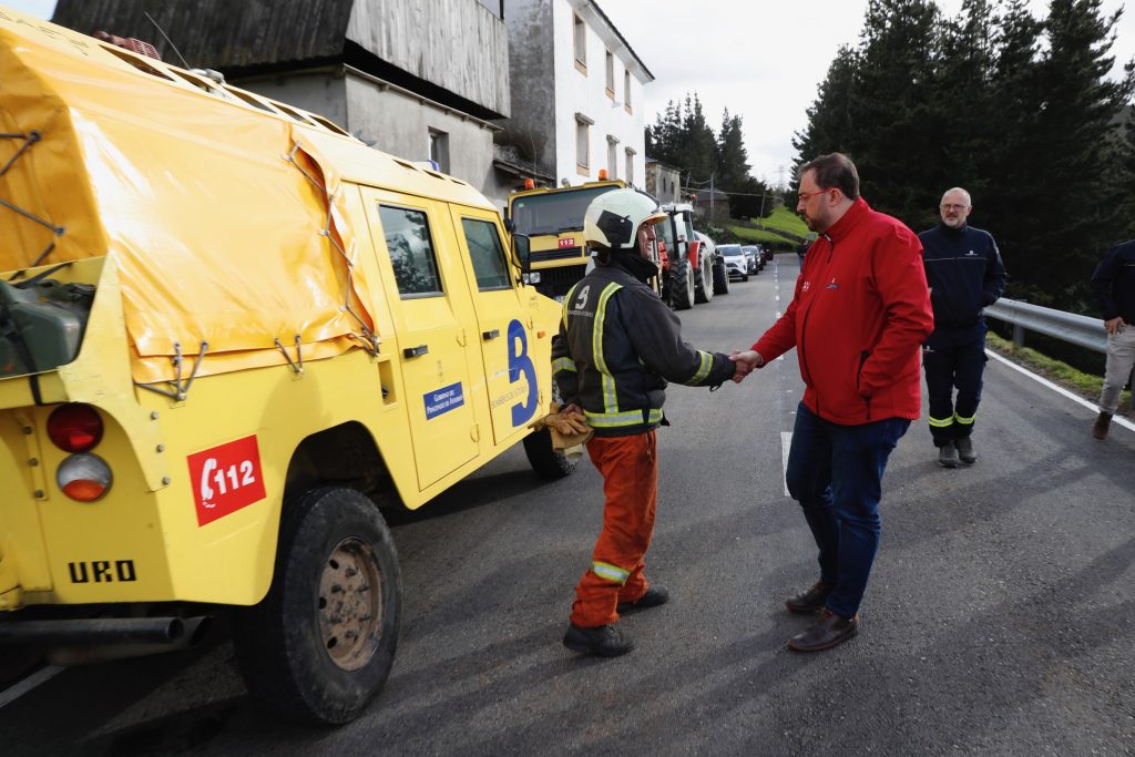 El presidente del Principado, Adrián Barbón, saluda a miembros del dispositivo de Bomberos de Asturias en el concejo de Allande.