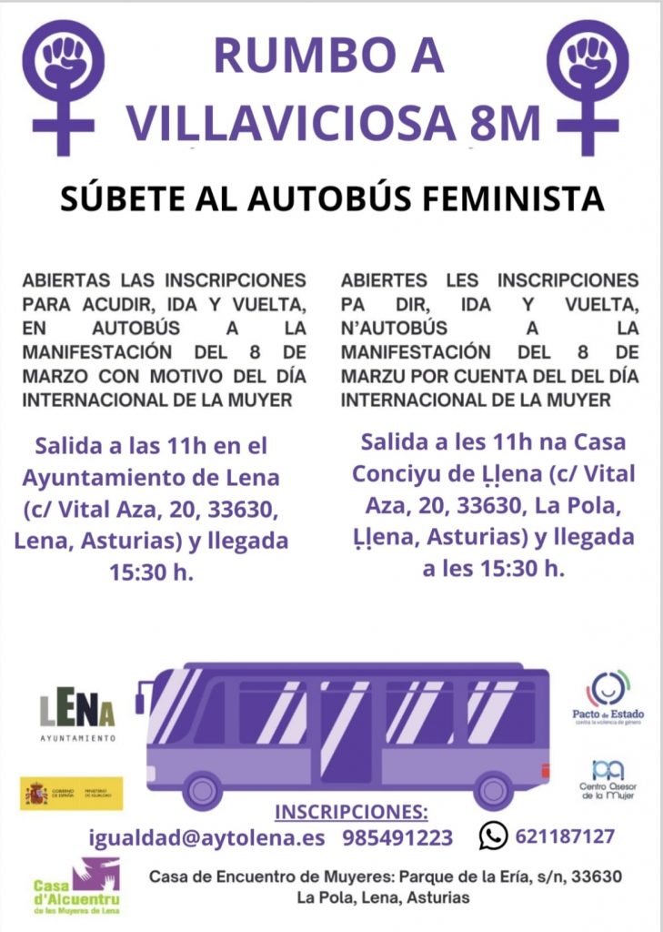 El Ayuntamiento de Lena ha abierto las inscripciones para participar en la manifestación del 8 de marzo, Día Internacional de la Mujer, que este año se celebrará en Villaviciosa, facilitando el desplazamiento en autobús para las personas interesadas.