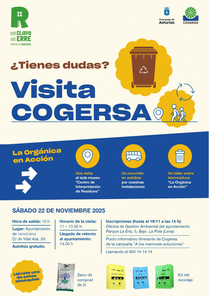 El Ayuntamiento de Lena invita a la ciudadanía a participar este sábado, 22 de noviembre, en una visita gratuita a las instalaciones de Cogersa, una actividad incluida en la campaña autonómica A los marrones, soluciones y diseñada para resolver dudas sobre la gestión de residuos y el uso del nuevo contenedor marrón.